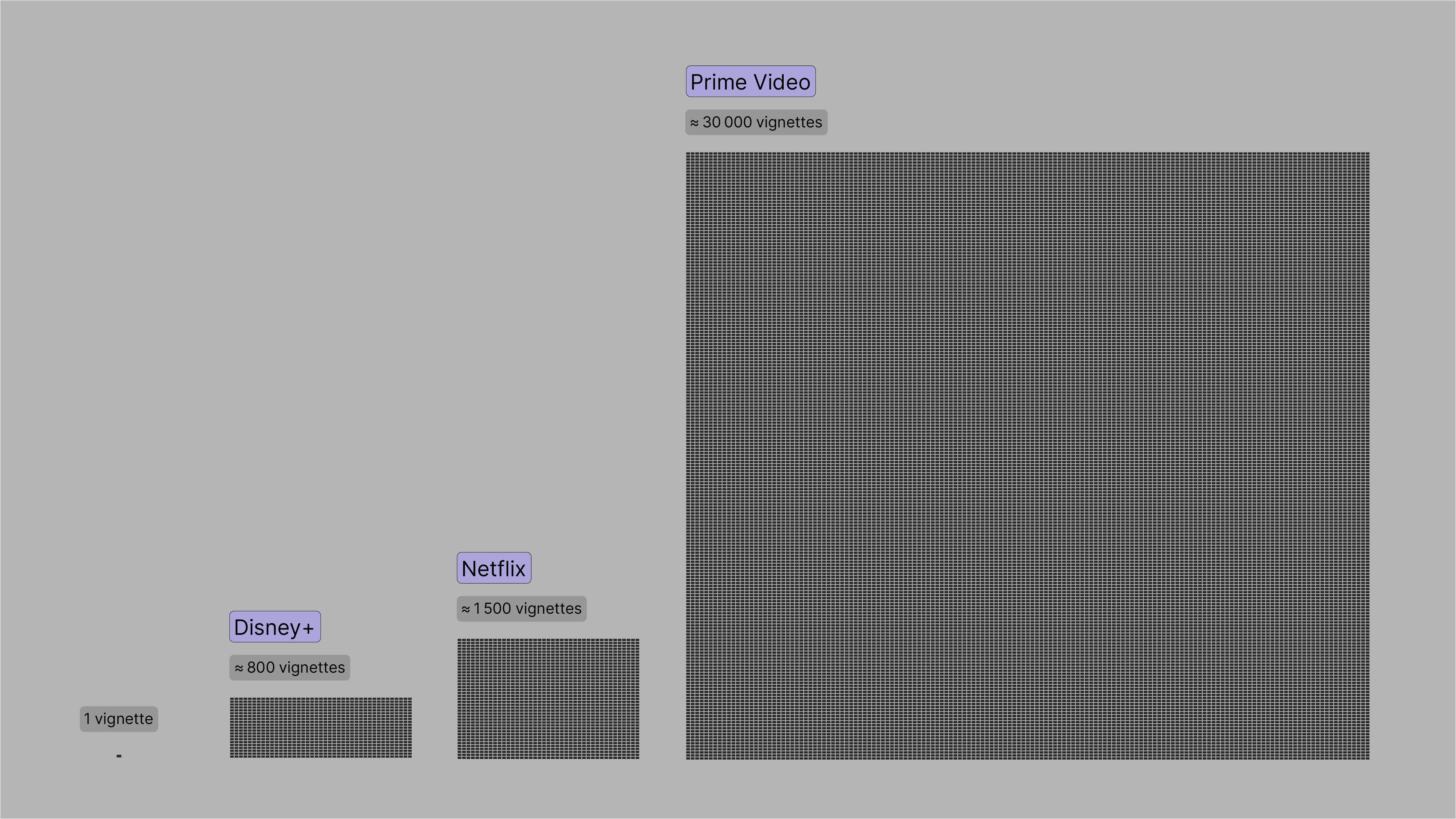 Contraints de filtrer leur catalogue et donc d'accorder à certains titres une meilleure visibilité qu'à d'autres, les services de streaming ont tous adopté une architecture de choix similaire, devenue familière à nous tous : des vignettes rectangulaires réparties en rangées thématiques qu'il est possible de faire défiler à l'horizontale. Les vignettes en haut à gauche de la page, c'est-à-dire aux premières positions sur les premières rangées, sont celles que l'utilisateur verra en premier. En quelque sorte, ces vignettes correspondent au « prime-time » à la télévision transposé à l'univers à-la-demande, qu'on pourrait appeler ici « prime-space ». La seule réelle différence en matière d'interface entre les différents services réside dans la taille de la page d'accueil. Là où Disney+ affiche entre 600 et 800 vignettes sur sa page d'accueil, Netflix en propose entre 1 400 et 1 500. Prime Video, de par sa position d'agrégateur d'offres et son modèle hybride entre abonnement et transactionnel, présente une page d'accueil bien plus vaste, pouvant aller jusqu'à plus de 30 000 vignettes.